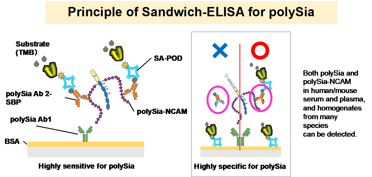 しかしながら、従来のpolySiaやpolySia-NCAMに対する市販抗体やそれを用いたキットは精度が十分でなく、polySiaに関する基礎研究およびバイオマーカーとしての応用開発は進んでいなかった。私たちは、polySiaに特異的に結合する抗体・中分子・低分子等のプローブ開発に取り組み、複数のプローブとそれらを用いたELISA(マウス脳組織polySia検出感度<1ng)を開発し、ヒト血中polySiaを簡便かつ高精度に検出・定量できることを実証した。