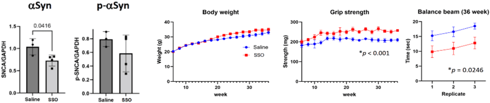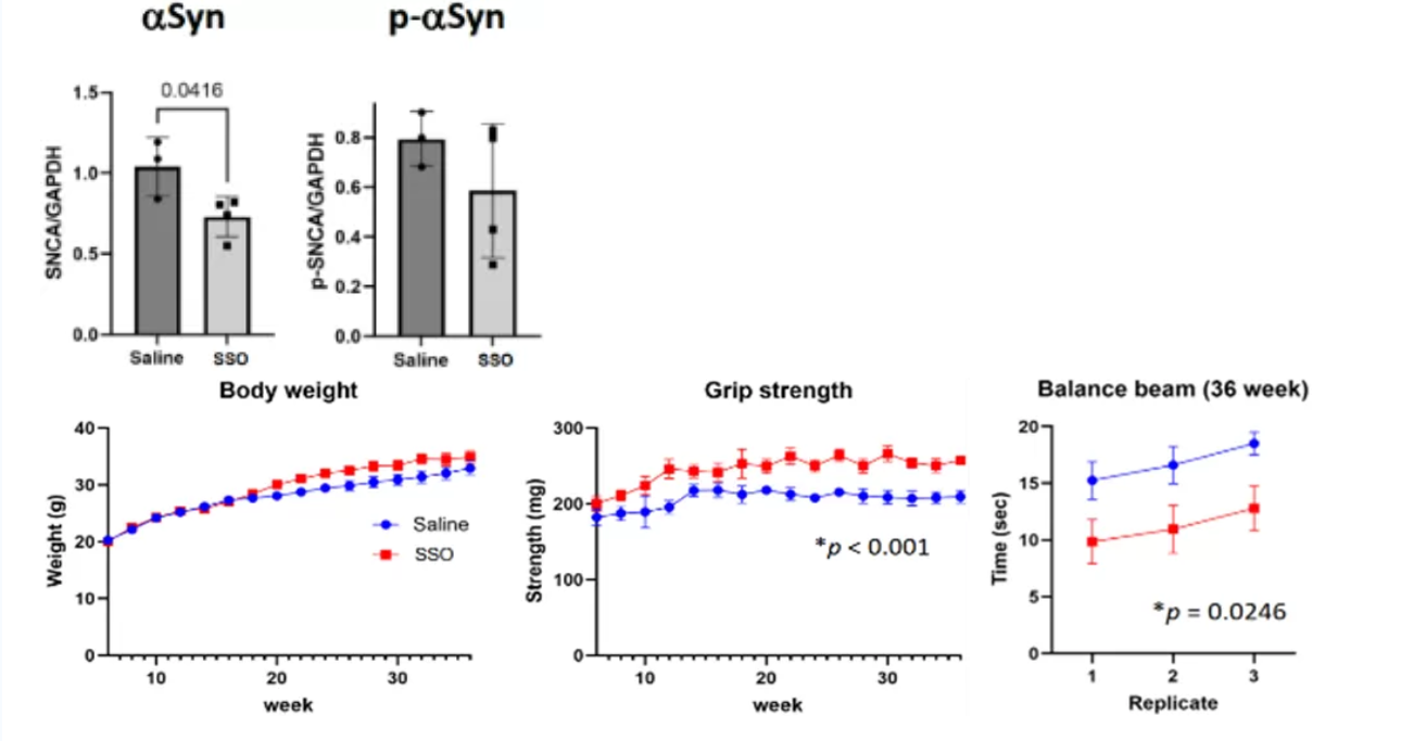 - 当該SSO投与により、パーキンソン病モデルマウス(+/+)の握力、バランスビームテスト、オープンフィールドテストで測定された運動機能障害を軽減(36週齢)。