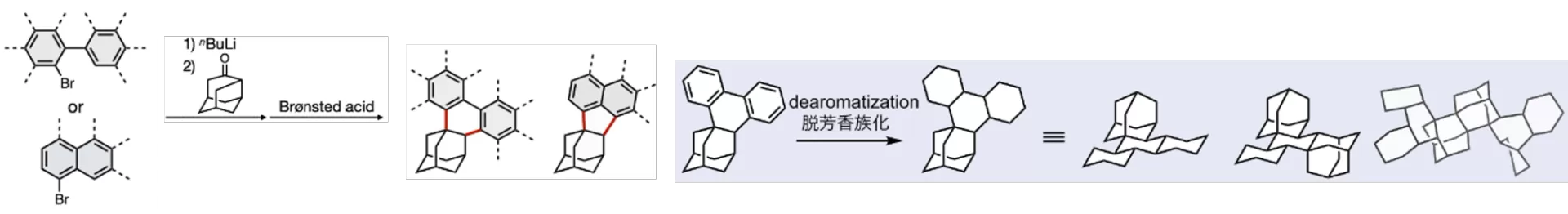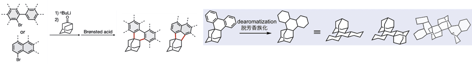 私たちは、分子合成的アプローチにより、ボトムアップで所望のダイヤモンド構造を構築することを目指して研究しており、アダマンタン縮環アレーンを合成する方法、およびアダマンタン縮環アレーンを脱芳香族化して高次ダイヤモンドイド化合物を合成する方法を新たに開発した。