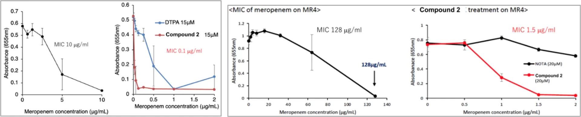 - 本化合物が、メタロβラクタマーゼIMP-1発現大腸菌(臨床分離株)のメロペネム(カルバペネム系抗生物質)に対する感受性を100倍以上向上させ(上左図)、多剤耐性緑膿菌(臨床分離株)の感受性を85倍以上向上(2µg/ml以下)させる(上右図)ことを実証済み。