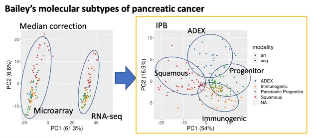 - 次世代シーケンサーとMicroarrayはモダリティの違いから得られるデータに大きな誤差が生じるが、本発明手法でこれらをマージし、Bailey et al.による膵がんのサブタイプ分類が可能であることを示した(図)。