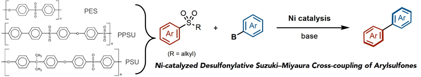 私たちは、ニッケル触媒を用いてスルホニル基をクロスカップリング反応の官能基として用いる方法を見出し、様々な基質を用いることを可能にした。さらに、スルホニル基をもつ基質としてスルホンポリマーを用いることにより、スルホンポリマーを分解することに成功した。