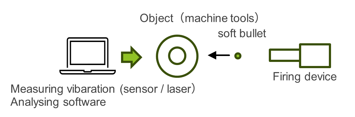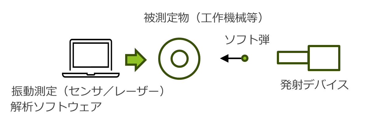 本技術は、ハンマより小さい、直径数mmのソフト弾(例:BB弾)を高速で被測定物に撃ちつけて加振することが特徴である。弾丸の素材は、被測定物よりやわらかい硬質樹脂や軟質金属で打痕を残さない。弾の寸法は、概ねこれに比例して加振の時間幅が小さくなるため、被測定物に対して十分に小さくすることで実質的に理想のインパルス加振を行うことができる。したがって、様々なインパクトハンマや加振力センサを用意する必要はなく、その力の測定・解析も必要ない。また、二度打ちが発生せず、回転体の測定も容易である。
