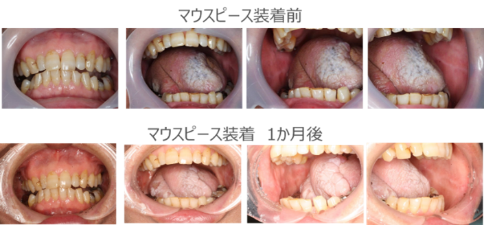 - 顎関節症や顎欠損補填用のマウスピース(陰圧で形状をフィットさせる)を基にして、タンニンを練りこんだ表面層を形成した。そのマウスピースを、口腔がんを切除後に口腔カンジダ症を発症した患者に使ってもらったところ、1か月で口腔カンジダ症が消失することを確認した(上図)。また、患者の使用感も問題ないことを確認した。