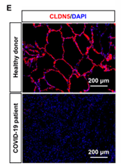 私たちは、独自の血管バリア破綻モデル系である気道チップを用いて、SARS-CoV-2が血管内皮細胞のCLDN5発現を抑制し、血管内皮細胞間の接着を減弱させることで、血管内皮バリアを破壊することを見出した。実際に、新型コロナウイルス感染症(COVID-19) 患者の肺においてCLDN5発現量が減少していることを確認した(右図)。さらに血管内皮細胞のCLDN5発現量を遺伝子導入や低分子薬(フルバスタチン)で増加させることで、SARS-CoV-2による血管内皮バリア破壊を抑止できることを確認した。これらのことから、CLDN5を標的とした化合物が、新型コロナウイルスを含む感染症の重症化や罹患後症状の治療薬になり得る可能性を見出した。