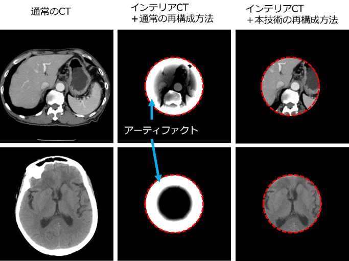 被曝量を低減して高精度のCT画像を取得できる「インテリアCT」技術において、CT画像の再構成時に原理的に生じるアーティファクト(誤差)の問題を解決し、アーティファクトなしのインテリアCT画像を取得できる。