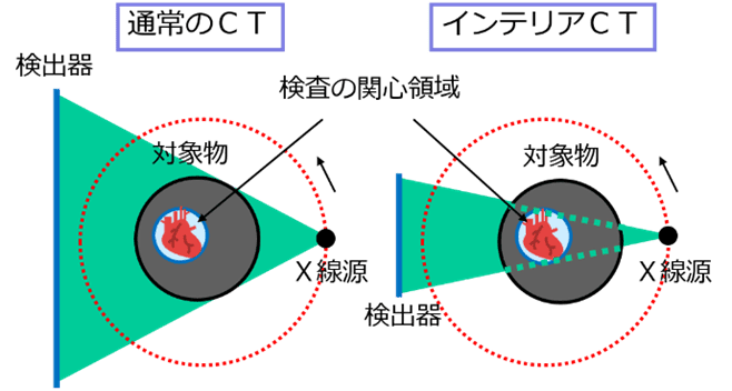 通常のCTと異なり、検査対象の内側の一部分のみをカバーするX線ビームを照射して画像を取得する技術が「インテリアCT」である(右図)。この手法によれば、例えば、がん腫瘍のある臓器や血管が梗塞した脳や心臓などに制限してX線を照射し、それ以外の部位の被曝なしに検査できる。これにより、通常のCTと比べ被曝量を大幅に抑えられる。また、工業用CT装置においては、検査のために試料サイズをトリミングする必要なく、半導体素子中の欠陥や異物の確認を簡便に測定することができる。