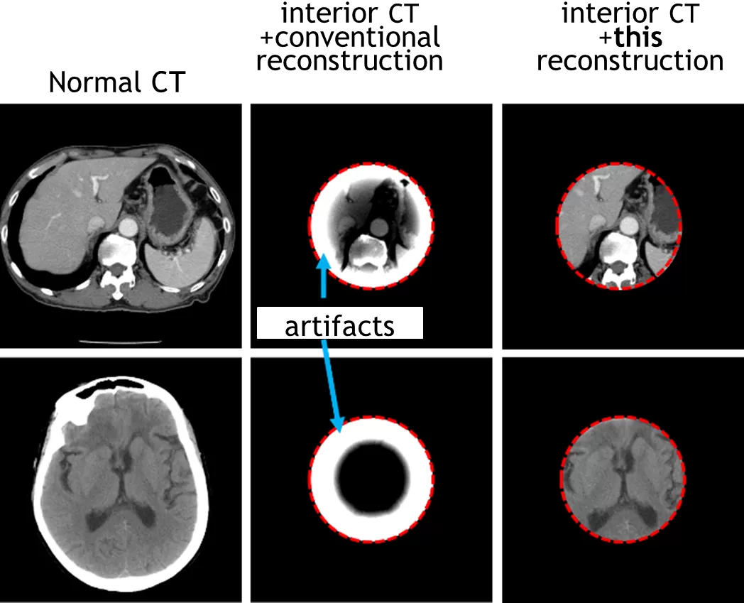 この度、筑波大学の工藤教授らは、このインテリアCTで生じるアーティファクトを大幅に削減・除去できる数学的に厳密なCT画像の再構成技術を完成した。従来の検査手法や装置を大きく変えることなく、インテリアCT撮像データにプラスアルファの僅かな情報を加えるのみでアーティファクトなしのCT画像を再構成できる。その結果、インテリアCTの持つ特長を最大限に発揮し、高精度・低アーティファクトのCT画像を、被曝量を大幅に抑えて取得できるようになる。