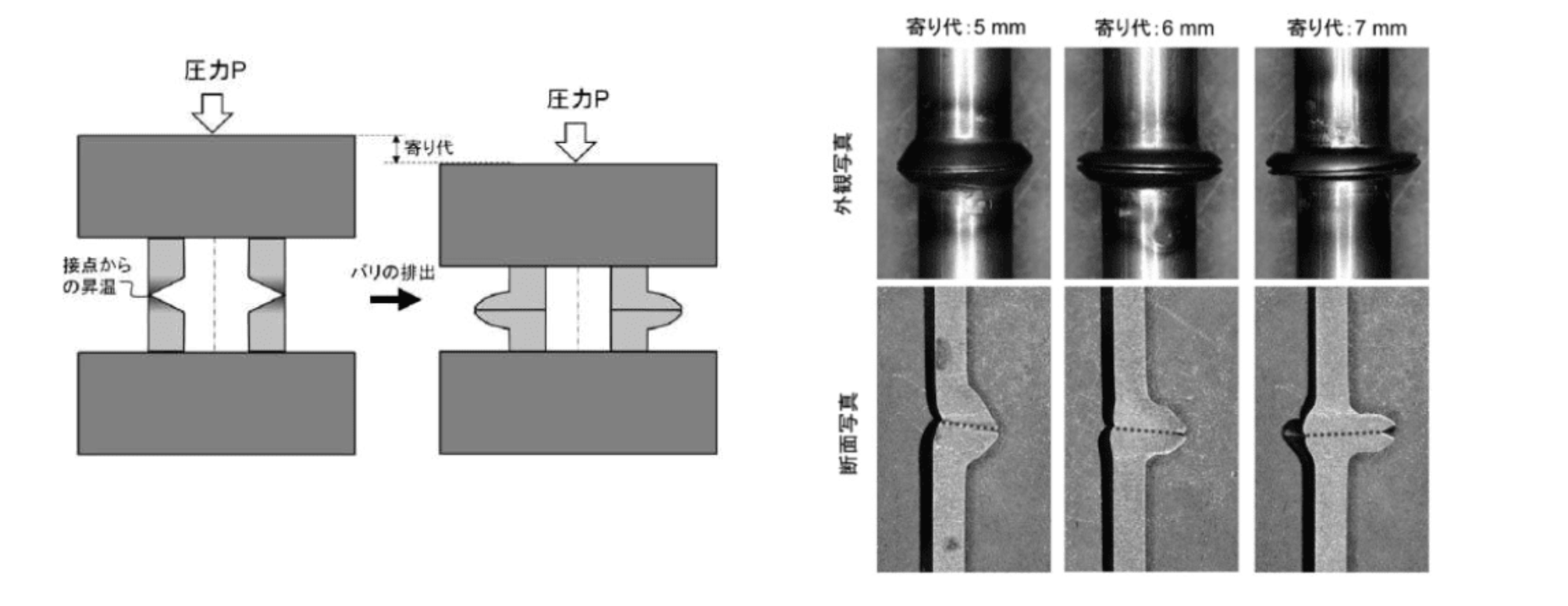 例えば、中炭素鋼S45Cパイプ材での実験結果は下右図の通り。厚さ2mmのS45Cパイプ材に対して、印加加重12.6kN、電流3000Aで接合したところ、通常形状では寄り代4mmで接合したが内壁が凹んだ。一方で角度30°のテーパーをパイプ材端部につけ抵抗接合したところ、適切な寄り代(本実験では6mm)で理想的な内壁を有するパイプ継手が作製できた。テーパー形状は通常形状より界面変形が大きいため、継手はより高い界面強度を有していると考えられる。