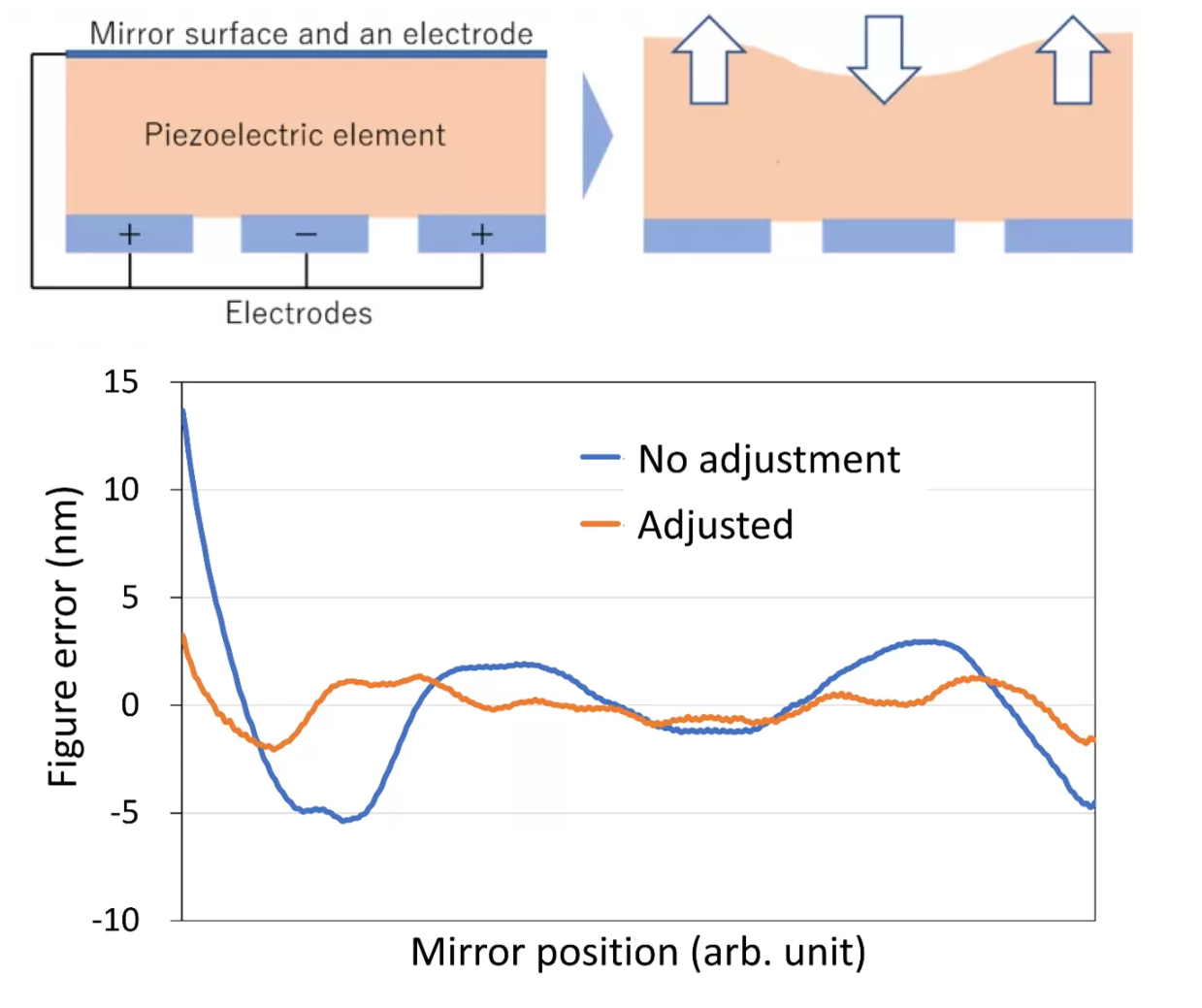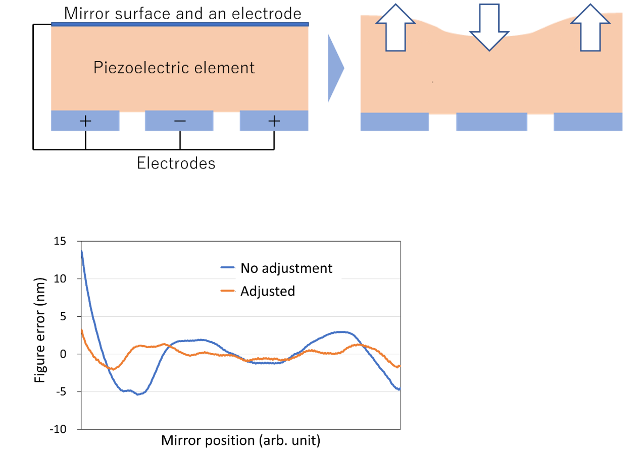 このミラーに、10 keVのエネルギーを持つX線を照射し、反射したX線をグレーティング干渉計で測定し、ミラー表面の形状誤差を測定した。その結果、ピエゾ素材によってミラーの表面を 10-30 pm/V 程度変形できることが確認できた。
