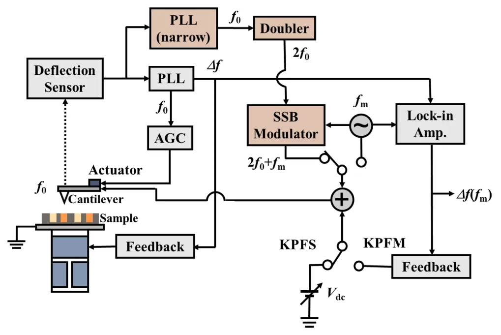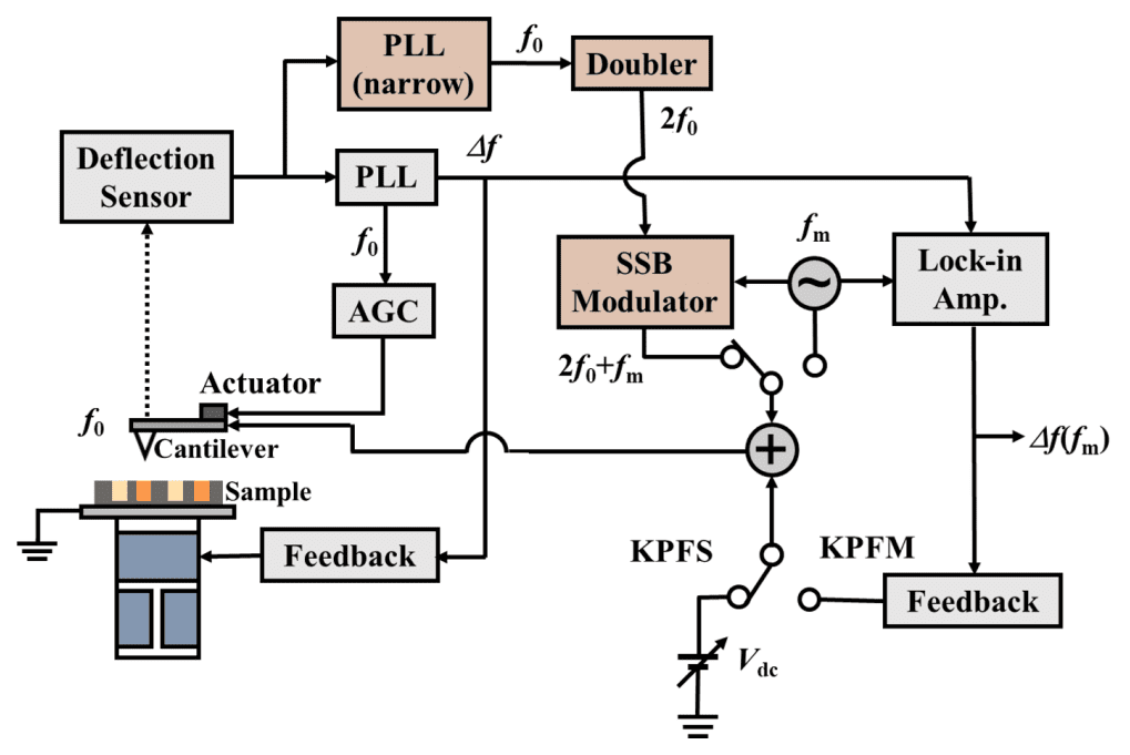図 1 本技術のKPFMの回路構成。図中中央右にある切替部で、高周波(2f0+fm)と低周波(fm)を切り替える。(菅原先生ら論文から引用)