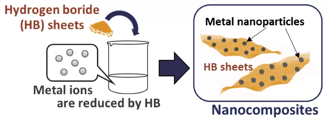 ホウ化水素(HB)は、還元剤の性質を持ち、ニッケルよりも酸化還元電位が高い金属、例えばSn、Cu、Pd、Pt、Auを還元します。そして、驚くべきことに、その還元した金属がHBの表面でナノ粒子として現れます(下図)。PtやPd、Auといった触媒活性に優れた貴金属が、粒径1-6 nmの高い分散性を持った状態でHB上に現れるため、その活性がさらに高まることが期待されます。