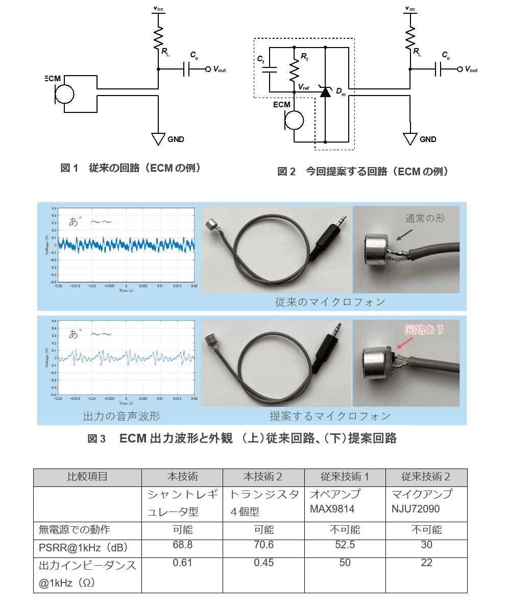 マイクロフォン(Electret Condenser Microphone; ECM)をはじめとする、現在広く使用されている各種センサは、一般的に図1に示すような回路で構成されており、電源由来ノイズや外来ノイズが重畳しやすいという課題がある。これらのノイズを低減するためには、従来、回路のシールド、ノイズキャンセル回路の追加、電源の低ノイズ化といった対策が必要とされてきた。