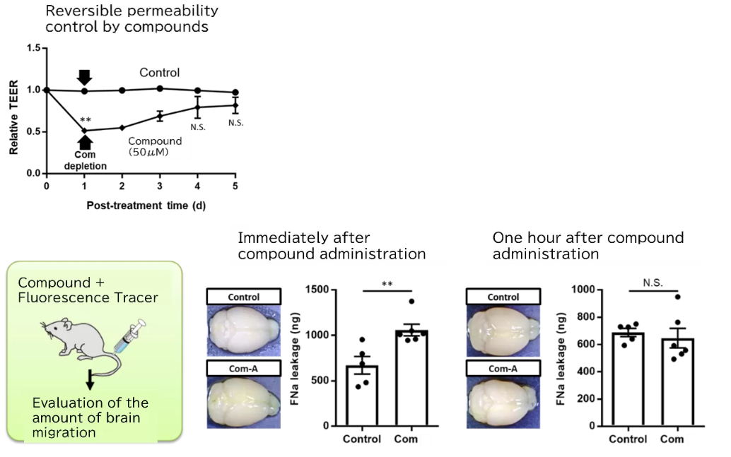 本研究者はBBBにおけるCLDN5の働きに着目し、CLDN5に結合して血管内皮細胞間のCLDN5同士の接着を一過的に緩め、低中分子を細胞間に透過させる低分子化合物を見出した。本分子は、この活性を介して、脳内への薬物送達を促進する。また、化合物のCLDN5への結合は一過性であり、可逆的な透過制御のためBBBが長時間開口するリスクも少ない。本技術は低中分子製剤の脳内送達に貢献すると期待される。