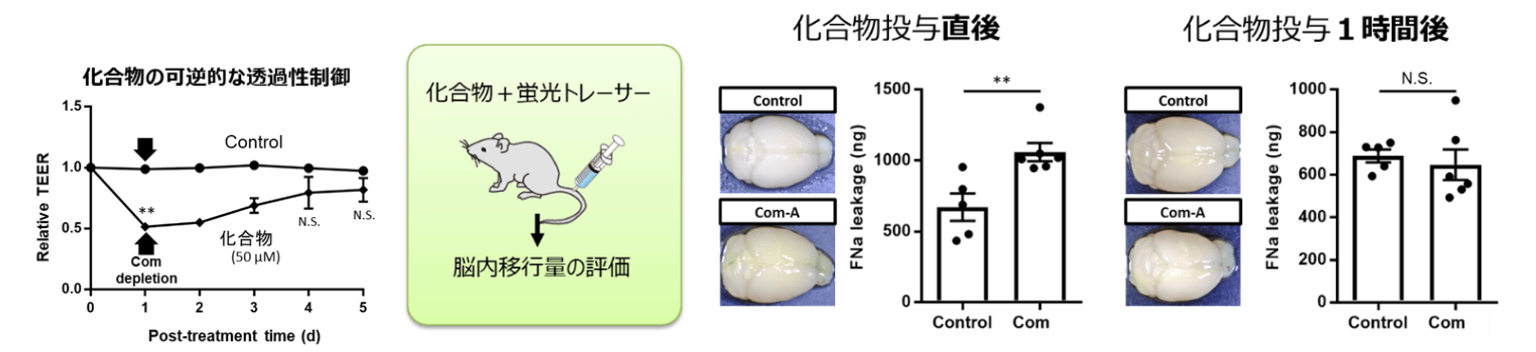 - マウスに化合物を尾静脈投与した直後にフルオレセンナトリウムを尾静脈投与したところ、脳内移行が確認されたが、化合物投与の1時間後にフルオレセンナトリウムを尾静脈投与した場合には、脳内移行は確認されなかった(下図)。