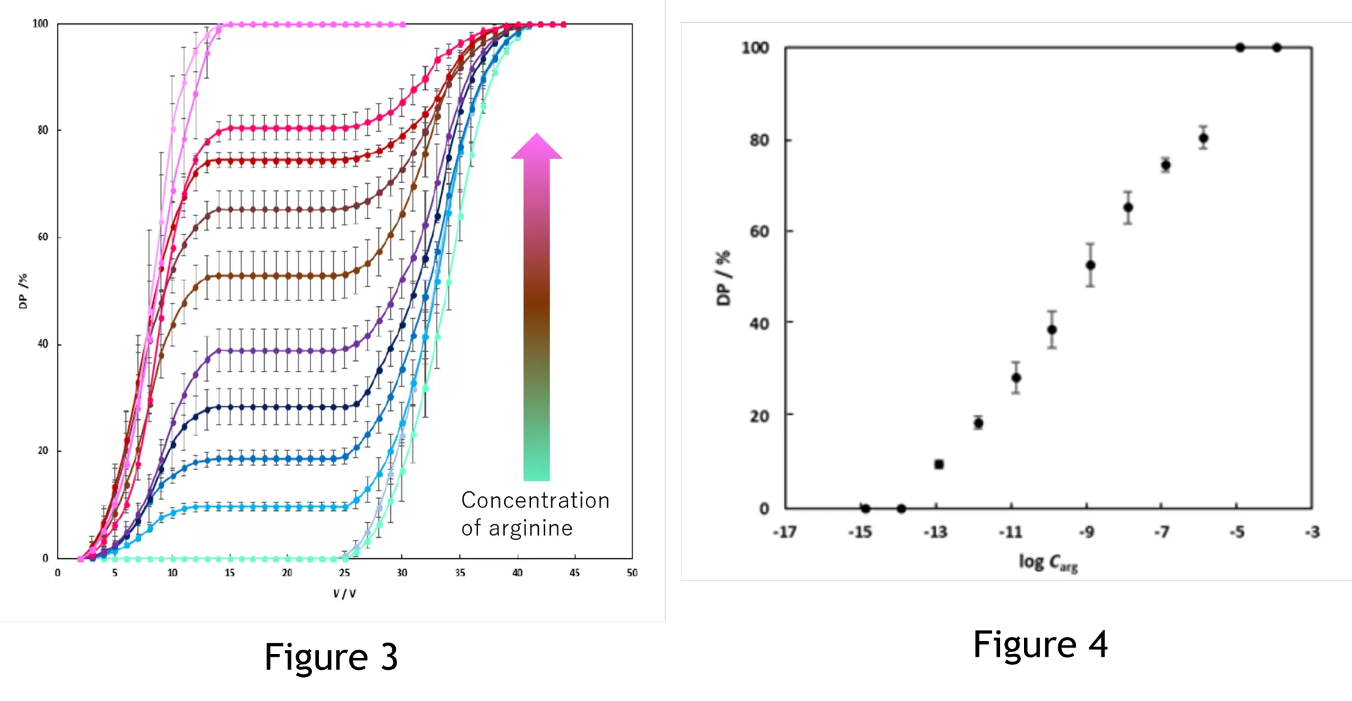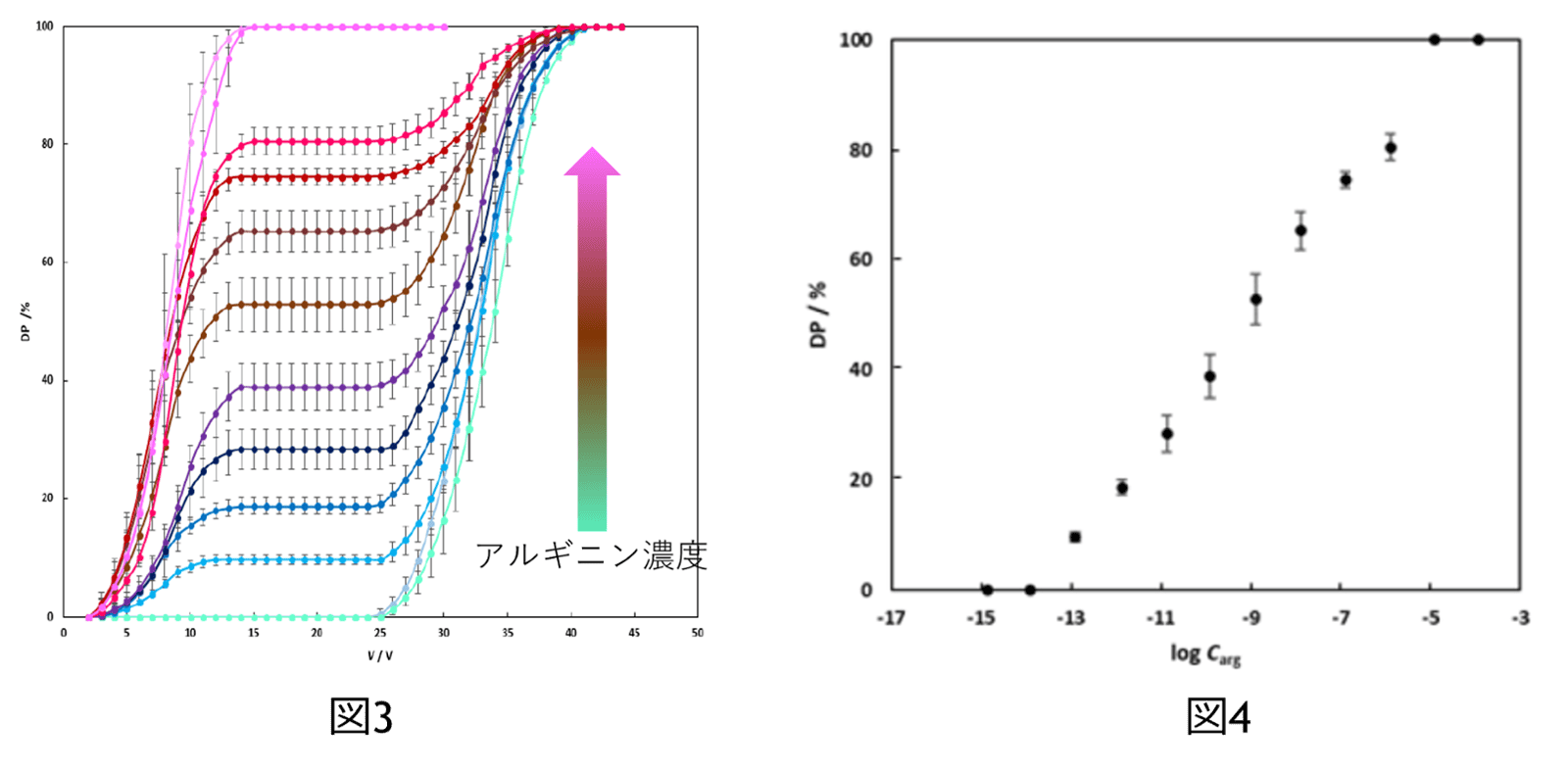 - モデルケースとして微小濃度のアルギニンを測定した。アルギニン特異的なアプタマーと、それに結合するレポーターDNA(ポリスチレン粒子に担持)を用いた実験系を構築した。アルギニンの濃度を変化しながら、超音波発生電圧とポリスチレン粒子の乖離率との関係性を計測した結果、図3のようになった。また、アルギニンの既知の濃度と図3中のプラトー部分(電圧に対して乖離率が変化しない部分)との関係をプロットした検量線(図4)を作成した。この検量線から、検出限界は0.28pMであった。