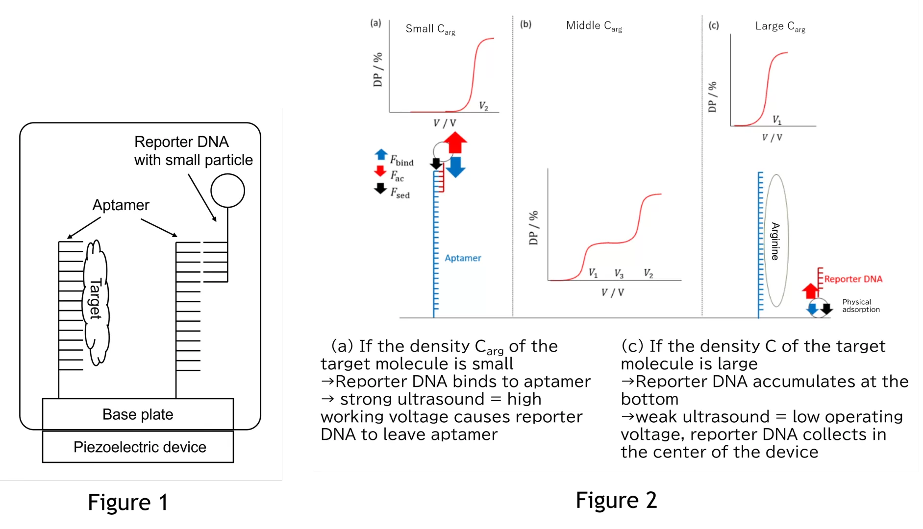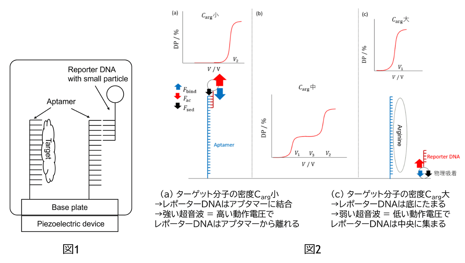 本技術のメカニズムを概説する。測定器は、それを満たす溶液中に漂うターゲット分子と、ターゲット分子に特異的に結合するアプタマー(測定器の底面に固定)、そしてそのアプタマーに結合するレポーターDNAがある(図1)。ターゲット分子の濃度が高い場合、アプタマーの多くがターゲット分子と結合するので、レポーターDNAはアプタマーに結合せず、測定器の底にたまっている(図2右)。このとき、超音波を垂直方向に照射すると、レポーターDNAは超音波によって底から浮揚し、最終的には測定器の中央に集まる(超音波は予め、測定器内で定在波を作り、節を中央部に作るように調整されている)。一方、ターゲット分子の濃度が薄い場合(図2左)、多くのレポーターDNAはアプタマーと結合しており、底にたまっている量が少ない。つまり、弱い超音波では測定器の中央に集まるレポーターDNAの量は少ない。しかし、超音波がある程度強くなれば、レポーターDNAはアプタマーから離れることができ、測定器中央に集まる量が増える。以上の現象を整理すると、測定器中央に集まるレポーターDNAの量と測定器に与える超音波の関係を見ることで、ターゲット分子の濃度を測定することができる(図2中央)。実際には、図2中央グラフのように、超音波を発生するための電圧(横軸)と、測定器中央に集まったレポーターDNAの割合(縦軸、顕微鏡観測と画像解析によりレポーターDNAを担持する粒子の個数を計測する)から検量線(図3、4)をあらかじめ作成しておく必要がある。