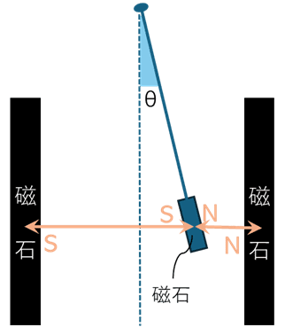 そこで本研究者は、振り子が大きい周期で振れている時の非等時性を、磁石を使って補正し、制振装置の制振性能の低下を抑制する手法を考案した。具体的には、右図のように振り子を磁石にし、さらに振り子が揺れる両脇に磁石(主に電磁石)を設置する。そして、振り子の揺れの位相に合わせて両脇の磁石から発生する磁場を制御することで振り子にかかる力(反発力や吸引力)を制御することで、周波数を一定に保つ、つまり等時性を確保する技術である。