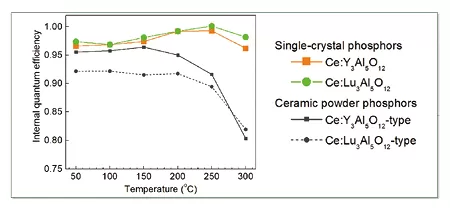 内部量子効率におけるYAG単結晶蛍光体(Ce: Y3Al3O12)と従来の焼結YAG粉末蛍光体との比較(Ce:Lu3AI3O12:セリウム添加ルテチウム)