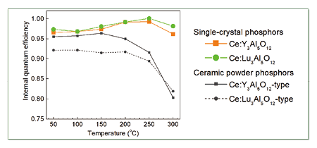 - 温度変化によるYAG単結晶蛍光体と従来の焼結YAG粉末の内部量子効率を調べたところ、焼結YAG粉末では温度上昇に伴い低下したが、YAG単結晶蛍光体は低下しないことを確認した。
