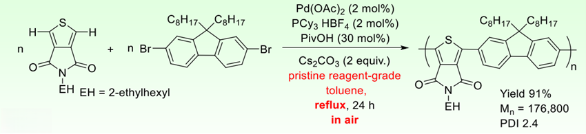 大気下、脱水脱酸素処理を施していない溶媒を使い、本技術によってπ共役高分子を合成する事例を多数報告している。例えば、以下のような反応では、91%の収率が得られた。