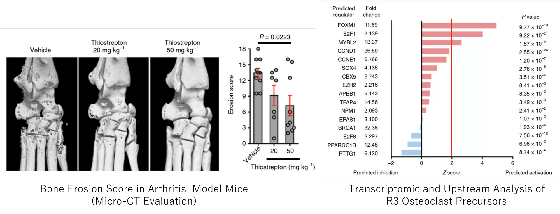 さらに、低分子化合物(例:RCM-1)によるFoxM1の阻害によって、in vitroおよびin vivoの両レベルで破骨細胞分化と骨破壊の抑制効果を確認。ヒト関節リウマチ患者検体においても同様の効果が得られたことから、FoxM1はRAにおける骨侵食を制御する新たな分子標的であり、本因子をターゲットとした低分子薬剤は、既存治療に対する有効な補完手段となることが示唆される。