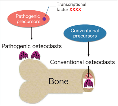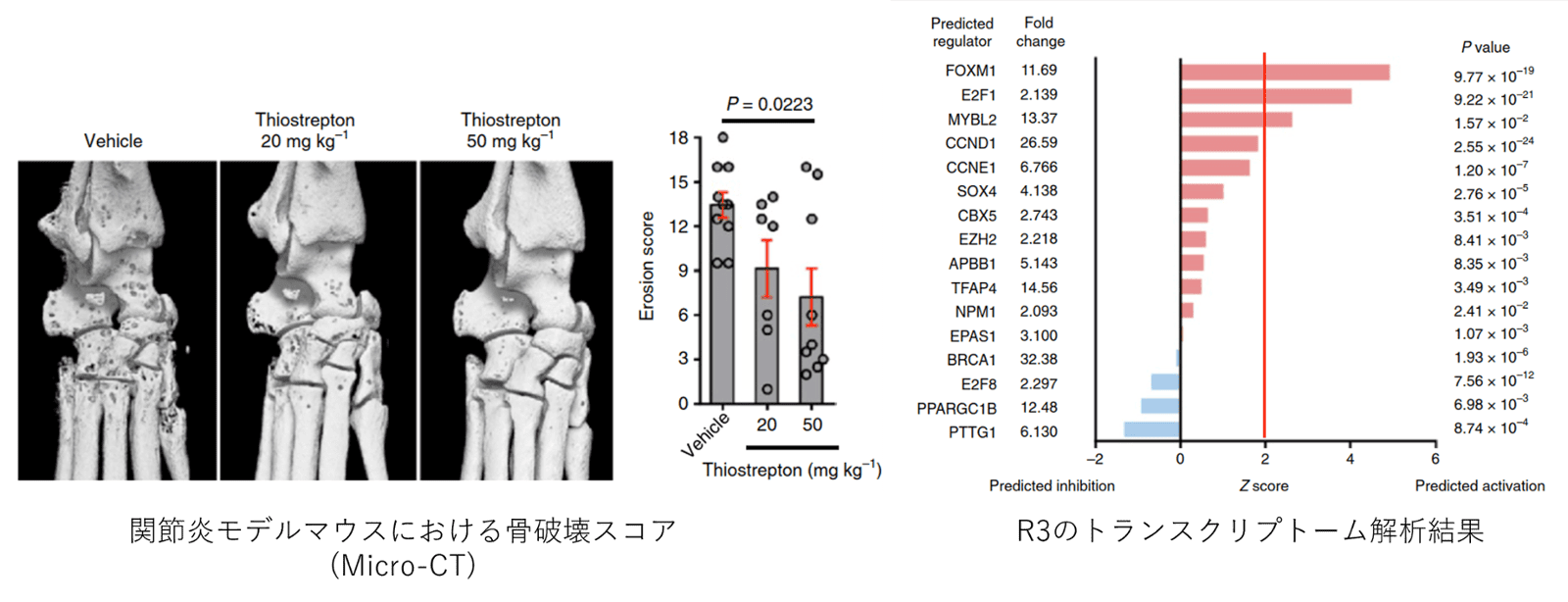 本研究では、RA病態に関与する炎症滑膜特異的な破骨前駆細胞(R3)を同定し、その細胞群に高発現する転写因子FoxM1(Forkhead box M1)が、悪玉破骨細胞への分化を誘導する主要な因子であることを明らかにした。