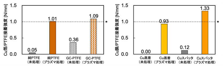 - 基材が純PTFEでもガラスクロス入りPTFEでも1.0 N/mm以上の高い接着強度を達成