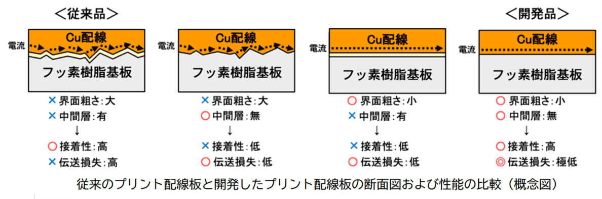 高周波化に伴う伝送損失の増加に対応するために、誘電体(樹脂基板)の材料は比誘電率と誘電正接が小さいフッ素樹脂に置き換わりつつある。しかしフッ素樹脂は接着性が乏しいため、Cu配線とフッ素樹脂の間に中間層を挿入したり、表面粗さが大きい Cu箔を使用したりする方法が採られてきた。しかし中間層はフッ素樹脂よりも比誘電率と誘電正接が高く、Cu箔は伝送経路が長くなるため、伝送損失を増加させる欠点があった。