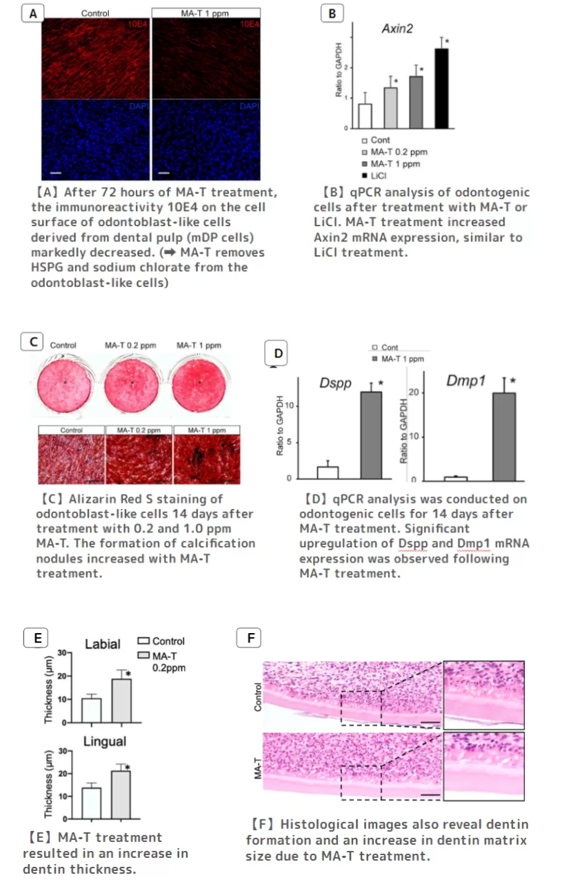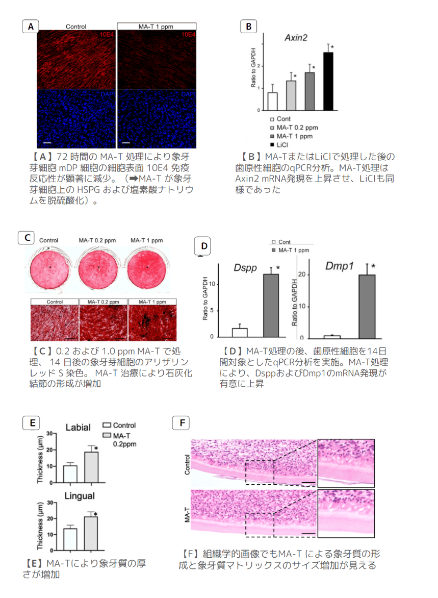 そこで研究者らは、MA-T (Matching Transformation System|要時生成型二酸化塩素水溶液)を用いて酸化反応を制御することで、アンモニウム塩などからなる分化誘導剤を用いることで、歯髄細胞から象牙芽細胞へ分化誘導が進むことを見出した。このことにより優れた象牙質再生用医薬組成物、覆髄剤の開発が進む可能性がある。