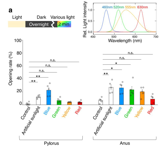 ● 幽門(食べる):青色光(Blue, 460 nm)に対して顕著な依存性を示し、特異的に開口
