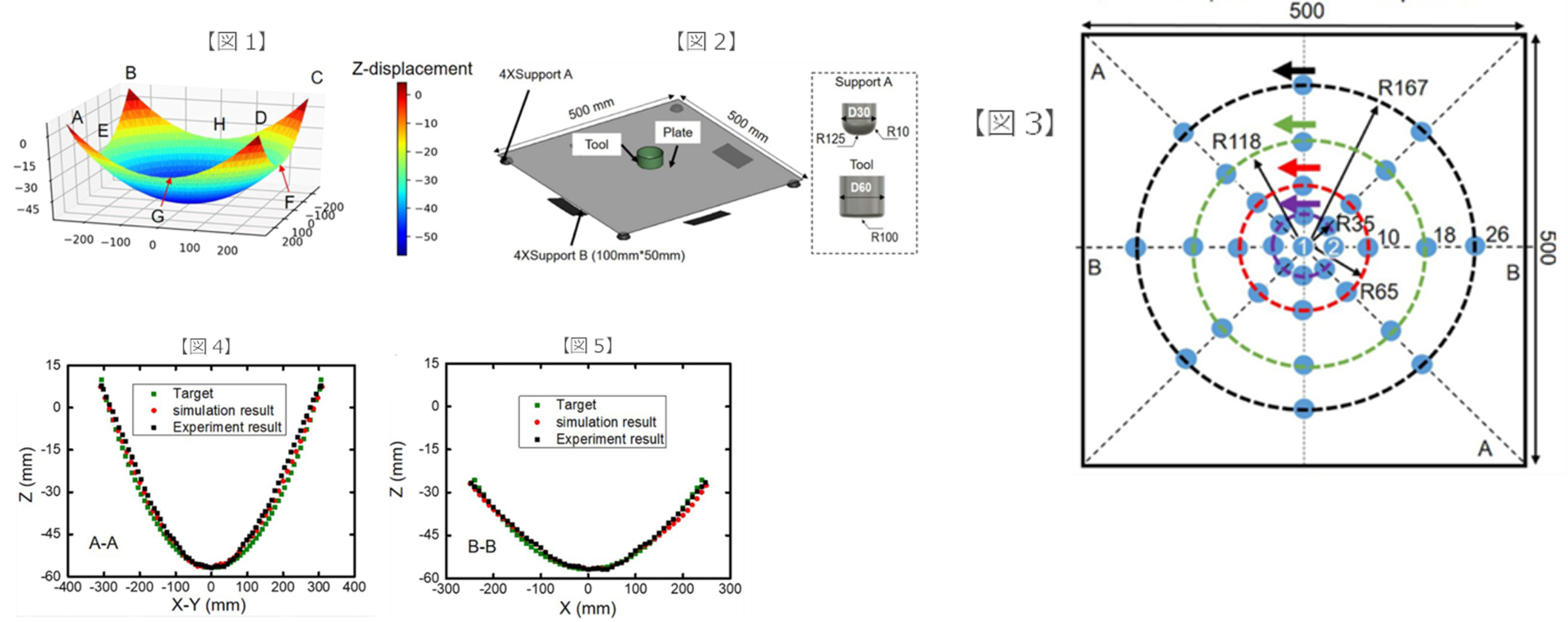 結果として図4(A-A断面)および図5(B-B断面)が示すとおり、目標形状(Target)に対する数値解析(simulation result)と検証試験(Experiment result)から、本技術の有効性が実証された。