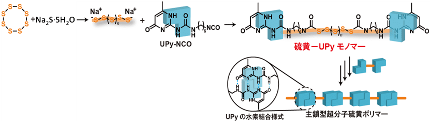 発明者は、超分子化学的アプローチにより硫黄ポリマーの安定化を実現した。具体的には直鎖硫黄の両末端に非共有結合部位(水素結合)を導入したモノマーを作製し、その非共有結合部位を連結させたことで、分子量の大きい超分子硫黄ポリマーを創製した。硫黄ポリマー末端のラジカルのバックバイティング(硫黄ポリマー分解の原因の一つ)は両末端の非共有結合部位により抑制されている。直鎖中に露出する硫黄分子により、電気的または光学的に特異な物性を示す可能性がある。また非共有結合部位の可逆的な架橋構造により、利用後に分解でき、さらに再結合形成により再利用できる環境負荷の低い材料となる可能性がある。
