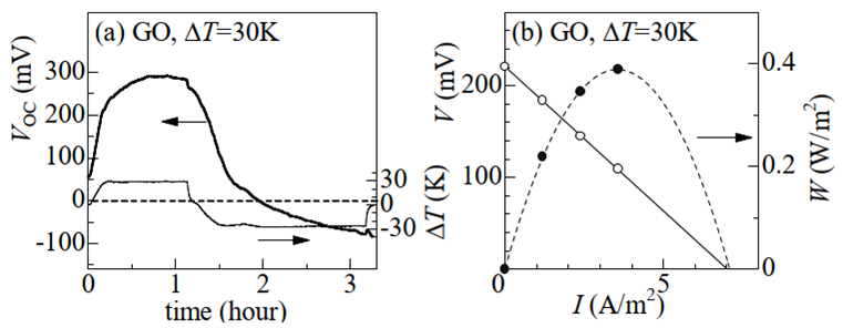 今般本研究者は、電極材料に絶縁体の酸化グラフェンを分散させることで、電極間の温度差30Kで約300mVの起電力を生じさせた。またこの起電力は電極冷却後も(例:日中の加熱により夜間でも)維持される。