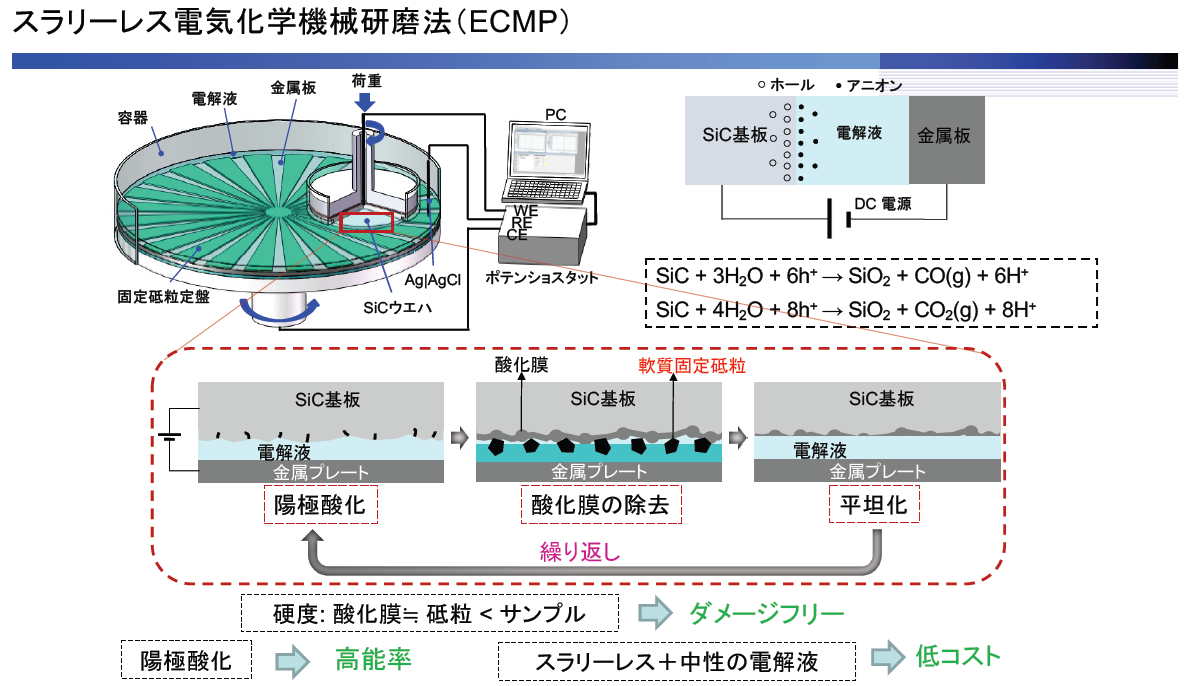 パワーデバイス用単結晶SiCの表面研磨では、ダイヤモンド砥粒での研磨後にダメージフリーに研磨仕上げする手法としてCMP(Chemical Mechanical Polishing)が用いられる。CMPはスラリーに含まれる砥粒と化学薬品により表面を改質しながら研磨する方法だが、研磨レートが遅く加工の空間分解能を有してないことや、化学薬品を含むスラリーの廃液処理コストが嵩むことなどが問題となっている。このようなCMPの問題解決のため、陽極酸化によるECMP等が従来から検討されている。