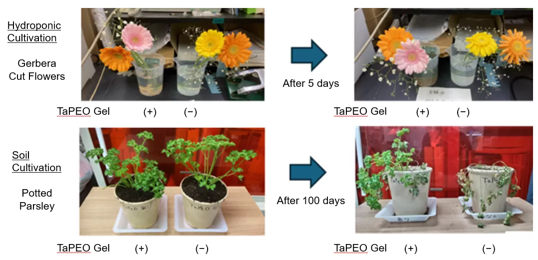 - 水耕栽培:得られたゲルを約1 cm四方の大きさに切断し、それを切り花(ガーベラ)の入った水に添加して常温で5日間放置した。その結果、TaPEOゲル添加のガーベラは対照と比較して花の状態が良く、長持ちすることを確認した(写真上)。