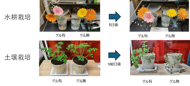 - 土壌栽培:得られたゲルを約1 cm四方の大きさに切断し、それを鉢植えの植物(パセリ)の土壌に埋めて実験室内(約25℃の恒温)に静置し、同じ日照・水やりの条件下で100日後のパセリの生育状態を比較したところ、対照と比較してTaPEOゲルを添加した土壌で生育させたパセリの方が長生きであることが分かった(写真下)。
