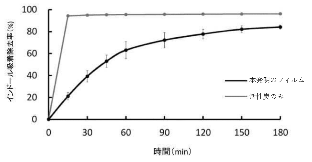 - 活性炭のみ(67 mg)、または同量の活性炭を含有する本発明のフィルムを、インドール溶液100 mL(30 mg/L)の中に添加し、溶液中の遊離インドールの濃度を紫外可視分光光度計で経時的に測定した。それぞれの、インドール吸着除去率を算出したところ、活性炭のみの場合は15分後にほぼ飽和に達する吸着効率が得られ、一方の本発明の活性炭含有こんにゃくフィルムも3時間で約84%を吸着できることを確認した。