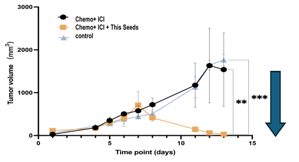 - 特にCDXマウスでの試験では、免疫チェックポイント阻害剤との併用により、腫瘍体積の大幅な減少(ほぼ完全消失)が確認された。