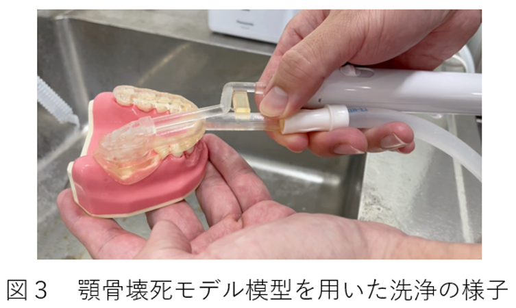 - 顎骨壊死モデル模型を用いて、試作した本発明の洗浄装置の性能試験を行った(図3)。残留食渣に性状が類似している10倍粥を用い、その洗浄を確認したところ、食渣はほとんど残留することなく洗浄できることを確認した。