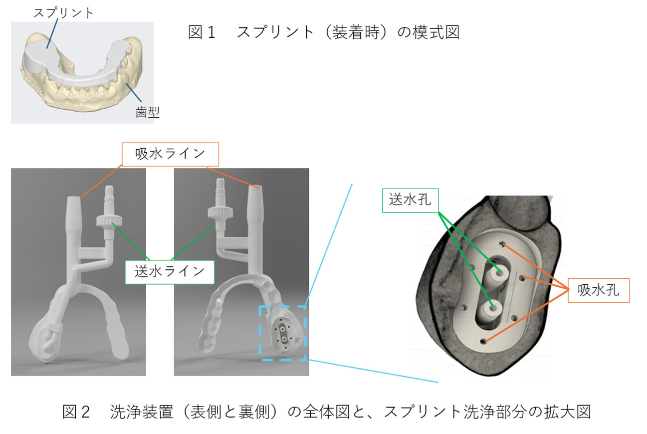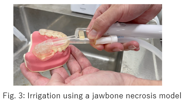 骨粗鬆症治療に有効なビスホスホネート製剤やデノスマブなどの骨吸収抑制薬は、薬剤関連顎骨壊死(MRONJ)という副作用を引き起こす可能性がある。MRONJの発症率は1,000人に1人程度であり、8週間以上の骨露出で診断され、治療は可能であれば外科的切除が行われる。しかしながら、腐骨と正常骨の境界が不明瞭なため過剰切除や取り残しのリスクがあり、そのため外科的切除の前に定期的な洗浄による保存的療法を行い腐骨の分離を促して切除ラインの決定が多くの場合行われる。またMRONJを発症する患者の多くは高齢者であり、全身的な問題から外科処置が困難な場合や患者が希望しない場合、外科的切除に代えて定期的な洗浄による保存的加療を行い、腐骨分離を促進することで治癒を図る方法が選択される。保存療法における創傷部の洗浄は、自宅での含嗽と専門家による定期的な洗浄が主流だが、含嗽では残留食渣の除去が難しく、頻回な来院が必要となり、患者(またその介護者、施設職員)と医療機関双方の負担が大きい。この負担を軽減するために口腔洗浄器が開発されているが、従来品は口腔内全体を対象としており、創傷部の食渣除去が不十分であるという問題があった。また、洗浄液が口腔内全体に流入するため、嚥下機能の低下した高齢者や障害者等では誤嚥のリスクも懸念されている。