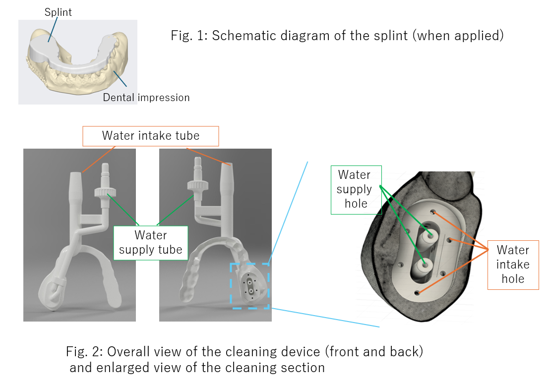 そこで、本研究者は口腔内の局所的な洗浄・吸引を患者自身が自宅でできるマウスピース型の口腔洗浄装置を開発した。具体的には、まず口腔内スキャナーで歯型データを取得した後、3Dプリンタを用いて創傷部を含む歯列のスプリントを作製する(図1)。続いて、スプリント内側に送水部と吸水部を加工しマウスピース内部で洗浄と吸引を可能にすることで(図2)、洗浄液のマウスピース外への流出が防止できる。このような洗浄水の吸引機構があるため誤嚥を防ぐことができ、座った状態でも使用が可能となることから、嚥下機能の低下した高齢者や障害者を含め患者自身による自宅での洗浄が可能となり、患者と医療機関の負担が大幅に軽減され、患者のQOLも向上することが期待される。