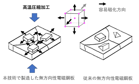 EVや産業用ロボットの高性能化に伴い、その心臓部であるモーターのさらなるエネルギー損失(鉄損)の低減が極めて重要な課題となっている。しかしながら、モーター鉄心に使われる無方向性電磁鋼板は従来、結晶配向を立体的にランダムにしてきたため、磁化容易軸が板面に沿わず、磁束密度が不足してヒステリシス損による鉄損が大きく、高効率化に限界があった。