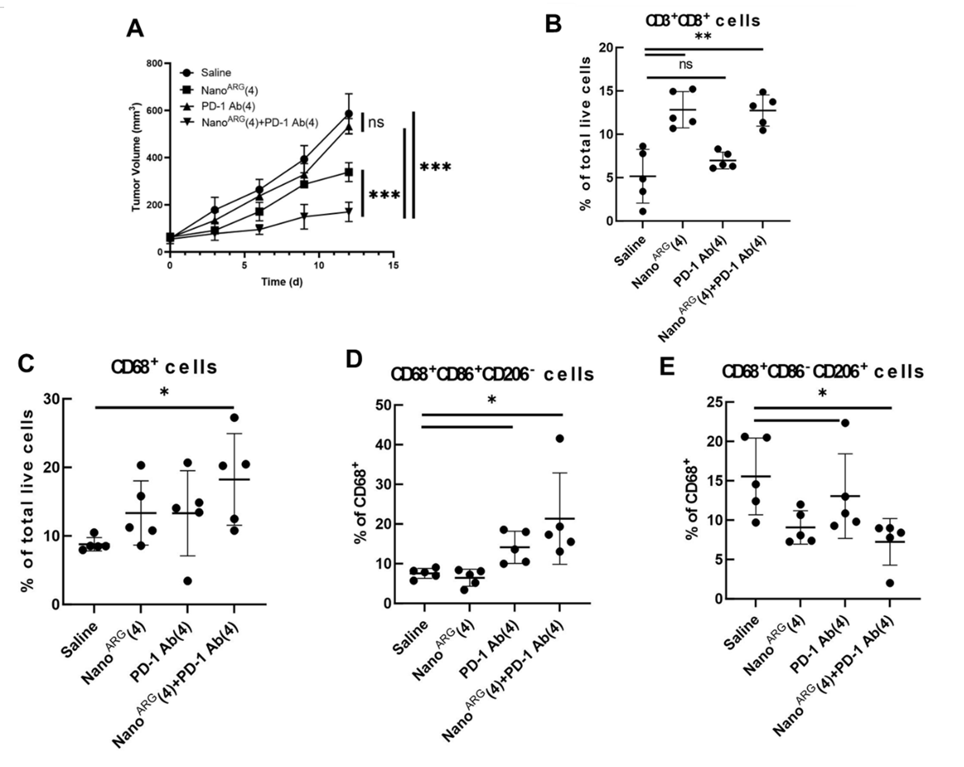 高濃度アルギニンを腫瘍微小環境に送達するナノミセル。PD-1抗体と協調的に免疫細胞を腫瘍集積させてTAMをM1優位に偏極、高濃度NOによる抗腫瘍効果