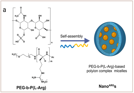 本発明者は、アルギニンの供給源として、プラス電荷のポリアルギニン・PEGブロックコポリマーとコンドロイチン硫酸を自己組織化させた、粒径約43nmのポリイオンコンプレックス(PIC)ミセルによってこの課題を解決することに成功した(図a)。本PICは静脈投与後、EPR効果により腫瘍組織へ選択的に集積する。取り込まれた先で酵素反応によりL-アルギニンを徐放し、iNOS代謝を介して高濃度NOを持続生成することで、がん細胞の直接殺傷と免疫細胞の浸潤を促進する。さらにPD-1抗体との併用により、TAMをM1型へ強力にリプログラミングし、腫瘍組織をColdからHotな状態へ転換することで、劇的な抗腫瘍相乗効果を発揮することが期待される。