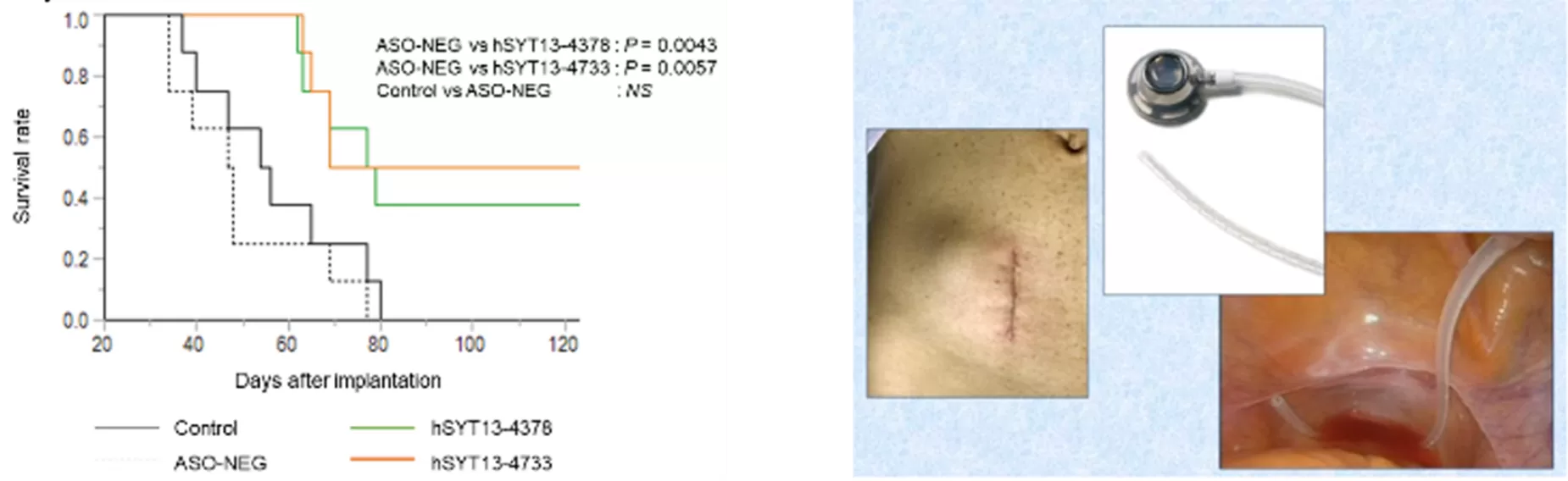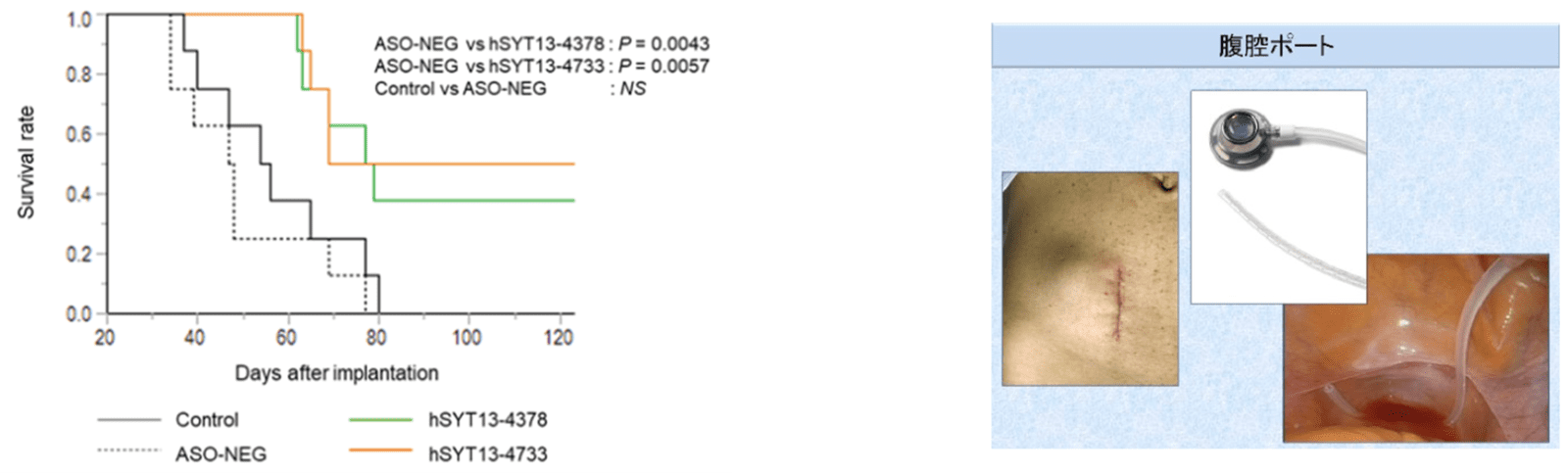 シナプトタグミン 13 (SYT13) は胃癌患者検体から同定された腹膜播種に特異的に発現する膜蛋白質である。細胞外領域が小さく抗体医薬による創薬可能性が低いため核酸医薬での開発が選択された。ヌクレアーゼ耐性アミド架橋核酸 (AmNA) 修飾ギャップマー アンチセンス オリゴヌクレオチド (ASO) を複数合成し、in vitro、in vivo 活性、肝毒性、オフターゲットリスク分析からASO-4733を選択した(左図)。腹腔留置可能なポート(右図)を介して局所投与するため、核酸医薬のデリバリー・コスト・毒性の問題を解決できる。