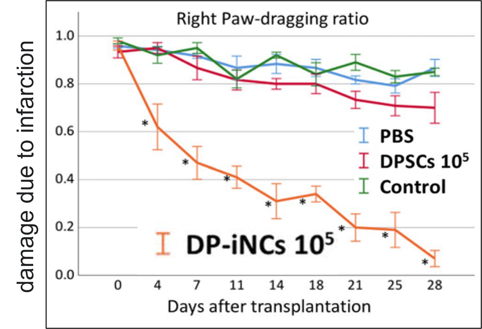 - 左中大脳動脈永久閉塞モデル免疫不全マウスの発症5日後の脳梗塞領域辺縁(深部)にDP-iNCと歯髄幹細胞を移植、DP-iNCでは移植細胞の神経回路形成が見られ、症状も有意に改善(図)。