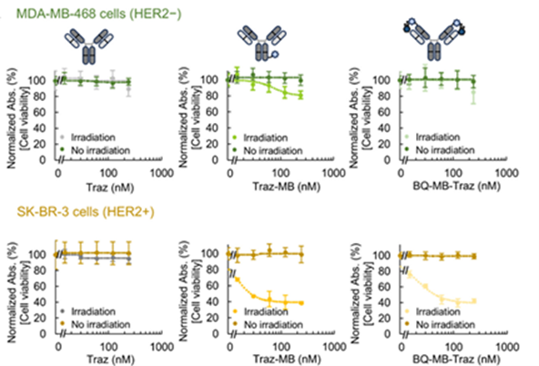 ・HER2陽性細胞において、BQ-MB-TrazのMB-Trazと同等の細胞障害効果を確認(下図下:中・右)。一方、MB-TrazがHER2陰性細胞に対して非特異的な毒性を示したのに対し、BQ-MB-Trazは高い選択性を維持することを実証(下図上:中・右)。