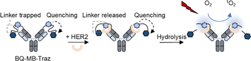 本技術ではリンカーで接続された光増感剤と消光剤を抗原結合部位のN末端に固定する。抗原に結合したときだけリンカーが露出し加水分解で消光剤を切断する。血中の薬剤やFc部分への非特異的に結合した薬剤は活性化することがないため光毒性を根本的に抑制できる(下図)。