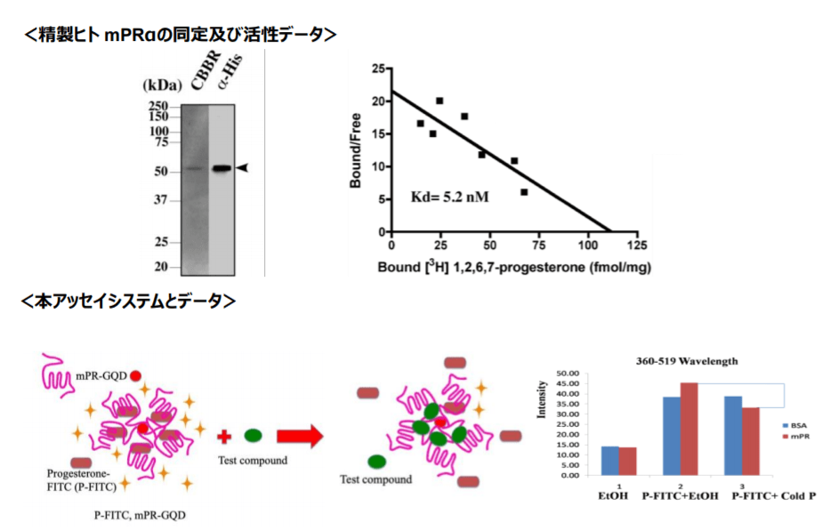 今回プロゲステロン膜受容体の一種であるヒト mPRαの精製に成功し、精製 mPRαのプロゲステロン結合活性を確認した。また、プロゲスチンの HTS を可能とするため、ヒトmPRα と量子ドット(GQD)の複合体を作製した。この複合体と標識プロゲステロンを予め結合させたものにテスト化合物を加え、蛍光強度を測定することで、テスト化合物の mPR 結合性を評価することが可能となる。また、ヒト乳腺癌細胞(MDA-MB-231)に mPRα及びルシフェラーゼ遺伝子(GloSensor)を産生する細胞株を保有しており、リガンド結合による mPR 活性の測定ができる。
